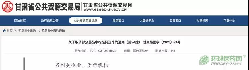 3月6日,甘肅省公共資源交易網(wǎng)發(fā)布《取消部分藥品中標掛網(wǎng)資格》的通知。