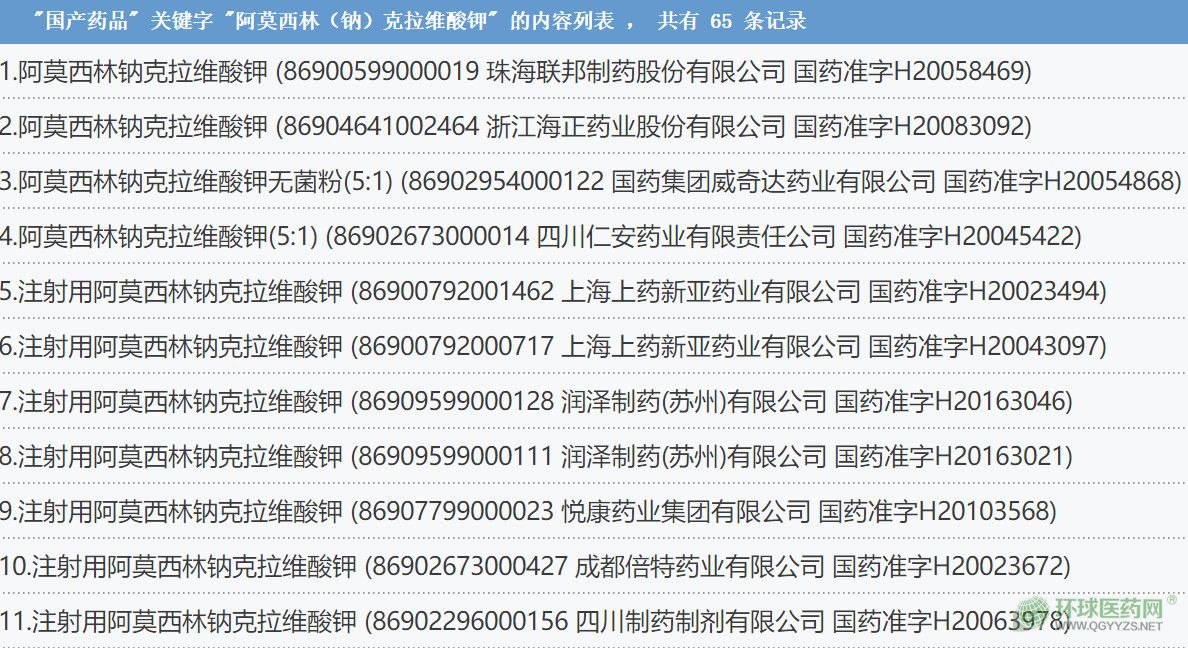 ▍阿莫西林(鈉)克拉維酸鉀共65國(guó)產(chǎn)批文
