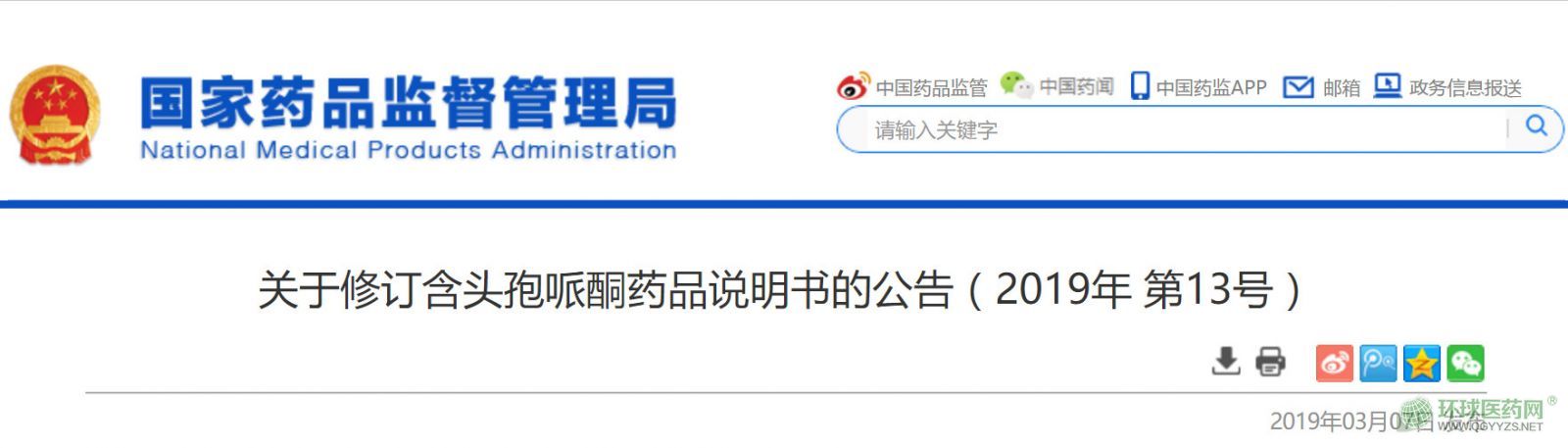 據(jù)《關(guān)于修訂含頭孢哌酮藥品說明書的公告》(2019年 第13號(hào)):