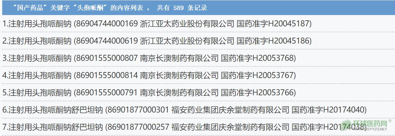 ▍頭孢哌酮藥品,589國(guó)產(chǎn)批文