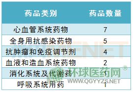 根據(jù)藥品治療類別,20個(gè)藥品中有7個(gè)為心血管系統(tǒng)藥物,全身用抗感染藥物有5個(gè),抗腫瘤和免疫調(diào)節(jié)劑有4個(gè),血液和造血系統(tǒng)藥物有2個(gè),消化系統(tǒng)及代謝藥和呼吸系統(tǒng)用藥各有1個(gè)。