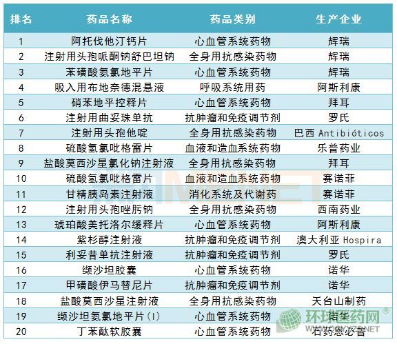 20個(gè)藥品中,有16個(gè)藥品的生產(chǎn)企業(yè)為外資企業(yè)。藥品數(shù)量最多的生產(chǎn)企業(yè)輝瑞、諾華均有3個(gè)藥品在列,輝瑞的3個(gè)藥品阿托伐他汀鈣片、注射用頭孢哌酮鈉舒巴坦鈉、苯磺酸氨氯地平片更是稱霸前三甲。據(jù)米內(nèi)網(wǎng)數(shù)據(jù),這20個(gè)藥品多數(shù)是相關(guān)生產(chǎn)企業(yè)在中國(guó)公立醫(yī)療機(jī)構(gòu)終端的主要銷售品種。
