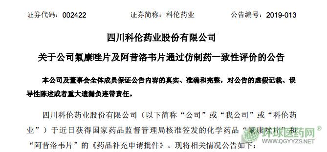 3月8日,四川科倫藥業(yè)發(fā)布公告,公司產(chǎn)品“氟康唑片(50mg)”和“阿昔洛韋片(0.1g、0.2g、0.4g)”,通過(guò)仿制藥一致性評(píng)價(jià)。