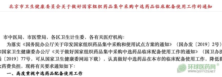 近日,北京市衛(wèi)健委發(fā)布文件《關(guān)于做好國家組織藥品集中采購中選藥品臨床配備使用工作的通知》(以下簡(jiǎn)稱《通知》)。