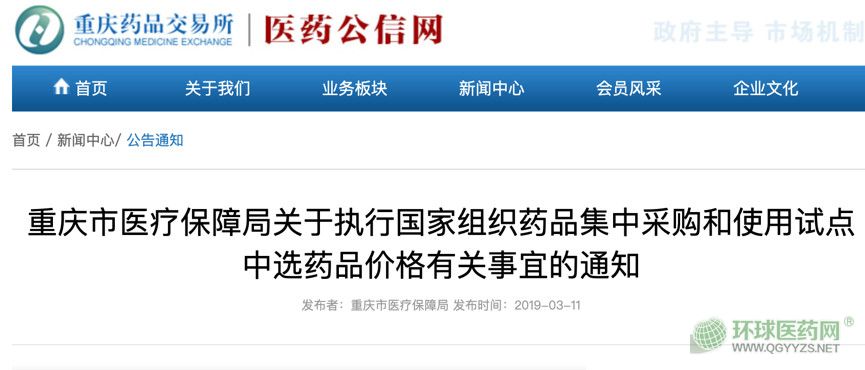 無獨(dú)有偶,今日(3月11日),重慶市醫(yī)保局發(fā)布文件,規(guī)定關(guān)于執(zhí)行帶量采購中選藥品的有關(guān)事宜,其中也對(duì)醫(yī)療機(jī)構(gòu)做出要求:醫(yī)院之前采購的存量藥品價(jià)格與中選藥品價(jià)格不一致的,在2019年3月20日前可按原采購價(jià)格向患者銷售,從2019年3月20日0時(shí)起,一律按中選藥品價(jià)格向患者銷售。