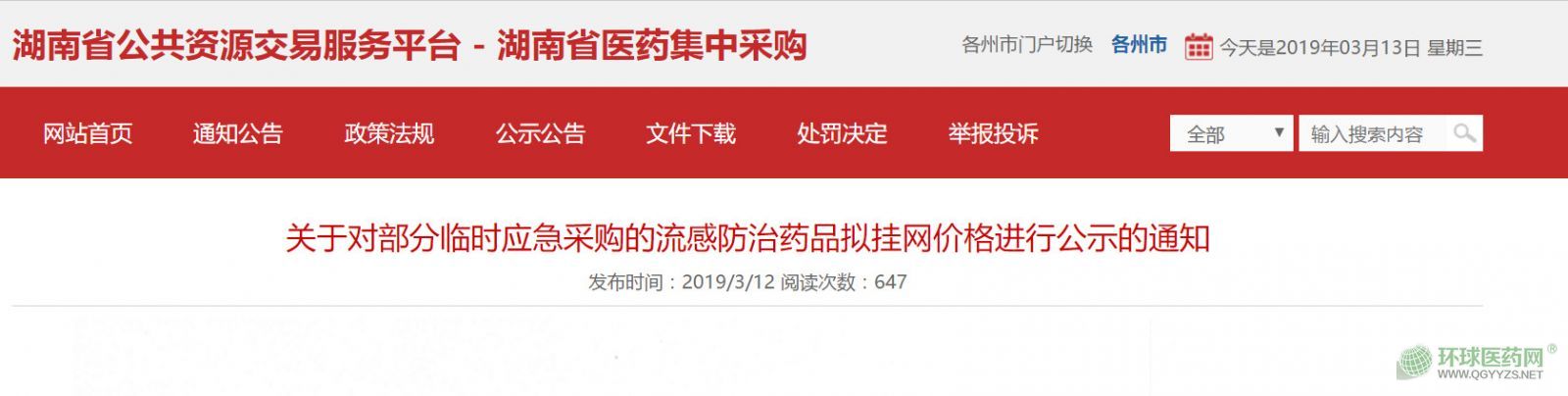 3月12日,湖南省公共資源交易服務(wù)平臺(tái)發(fā)布《關(guān)于對(duì)部分臨時(shí)應(yīng)急采購(gòu)的流感防治藥品擬掛網(wǎng)價(jià)格進(jìn)行公示的通知》(以下簡(jiǎn)稱(chēng)《通知》)。