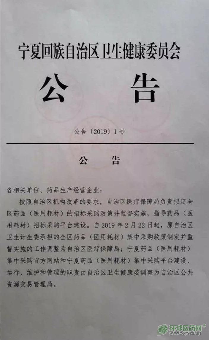 3月14日,寧夏回族自治區(qū)公共資源交易網掛出一則通知,通知是該自治區(qū)衛(wèi)生健康委員會發(fā)出的公告。公告指出,按照自治區(qū)機構改革要求,自治區(qū)醫(yī)療保障局負責擬定全區(qū)藥品(醫(yī)用耗材)的招標采購政策并監(jiān)督實施,指導招標采購平臺建設。