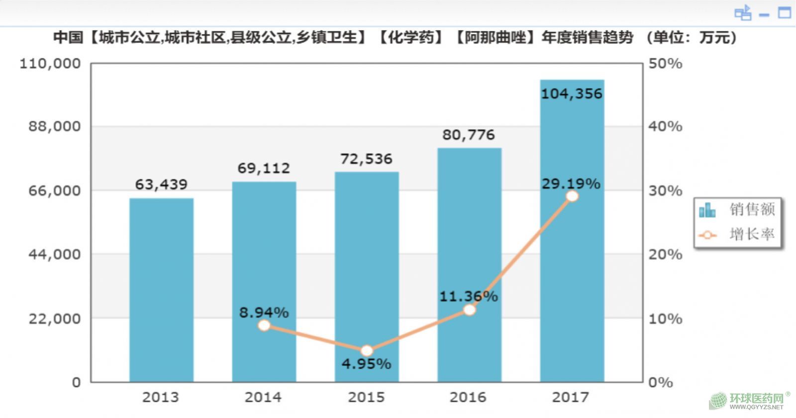 米內(nèi)網(wǎng)數(shù)據(jù)庫顯示,阿那曲唑2017年的市場規(guī)模為10.43億元,市場增速高達(dá)29.19%,增長率相比2016年翻了不止一倍?梢姡撈贩N的市場需求和發(fā)展?jié)摿κ志薮蟆?/p>