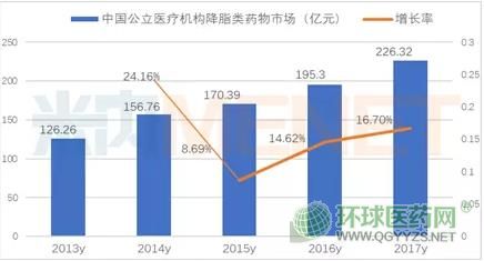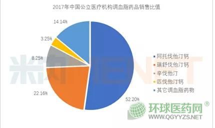 據(jù)米內(nèi)網(wǎng)數(shù)據(jù)顯示,2017年中國公立醫(yī)療機(jī)構(gòu)(城市公立醫(yī)院、縣級公立醫(yī)院、城市社區(qū)中心及鄉(xiāng)鎮(zhèn)衛(wèi)生院)終端降血脂藥物銷售額達(dá)到了226.32億元,同比上一年增長了16.70%。此外,國內(nèi)零售藥店終端降血脂藥物市場銷售額也達(dá)到了40.99億元。如果加上民營醫(yī)院、部隊(duì)醫(yī)院等將超越300億元。中國公立醫(yī)療機(jī)構(gòu)終端四大降血脂藥物為阿托伐他汀鈣占據(jù)了52.20%,瑞舒伐他汀鈣占22.16%,辛伐他汀占據(jù)了8.25%,匹伐他汀鈣片占據(jù)了3.25%,已從群雄爭霸的年代,進(jìn)入四品鼎沸的市場局面。