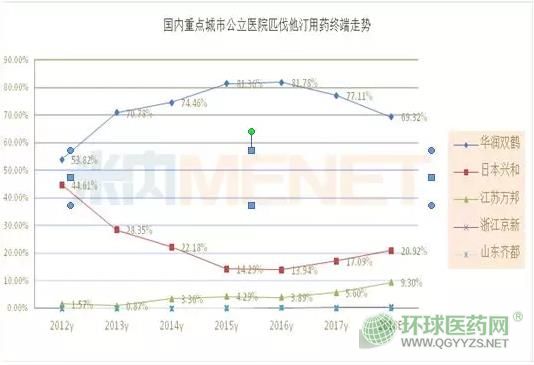 2018年重點(diǎn)城市公立醫(yī)院匹伐他汀鈣競爭格局是華潤雙鶴藥業(yè)的冠爽占據(jù)了69.32%,日本興和公司的力清之占據(jù)了20.92%,江蘇萬邦生化醫(yī)藥的邦之占據(jù)了9.30%,浙江京新藥業(yè)的京可新占據(jù)了0.46%。日本興和的力清之、江蘇萬邦生化醫(yī)藥的邦之和浙江京新藥業(yè)的京可新均比2018年顯示出增長趨勢,而華潤雙鶴藥業(yè)的冠爽的占比顯示出下滑。