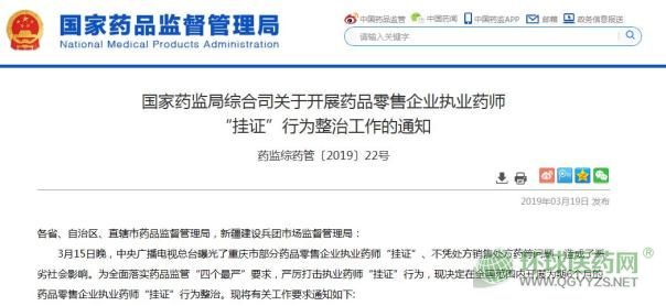 所有注冊執(zhí)業(yè)在藥品零售企業(yè)的執(zhí)業(yè)藥師亦須一并開展自查,凡是存在“掛證”行為、不能在崗服務(wù)的執(zhí)業(yè)藥師,應(yīng)立即改正或于2019年 4月30日前主動申請注銷《執(zhí)業(yè)藥師注冊證》。