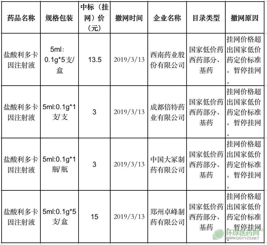 通知顯示,西南藥業(yè)、成都倍特藥業(yè)、中國大冢制藥和鄭州卓峰制藥的產(chǎn)品鹽酸利多卡因注射液,因為掛網(wǎng)價格超出國家低價藥定價標準,被暫停掛網(wǎng)。