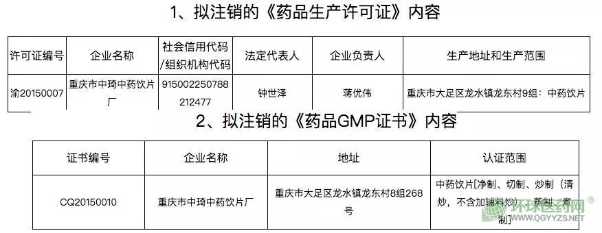 3月21日,重慶市藥監(jiān)局發(fā)布《關(guān)于擬注銷重慶市中琦中藥飲片廠《藥品生產(chǎn)許可證》及《藥品GMP證書》的公示。