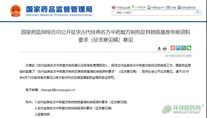 3月27日,國家藥品監(jiān)督管理局官網(wǎng)掛網(wǎng)《國家藥監(jiān)局綜合司公開征求古代經(jīng)典名方中藥復方制劑及其物質基準申報資料要求(征求意見稿)意見》,根據(jù)《中華人民共和國中醫(yī)藥法》和中共中央辦公廳、國務院辦公廳《關于深化審評審批制度改革鼓勵藥品醫(yī)療器械創(chuàng)新的意見》(廳字〔2017〕42號)以及《古代經(jīng)典名方中藥復方制劑簡化注冊審批管理規(guī)定》的相關精神,進一步規(guī)范古代經(jīng)典名方中藥復方制劑的研究。