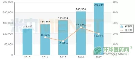 據(jù)米內(nèi)網(wǎng)數(shù)據(jù)顯示,2017年在中國(guó)城市公立醫(yī)院、縣級(jí)公立醫(yī)院、城市社區(qū)中心及鄉(xiāng)鎮(zhèn)衛(wèi)生院(簡(jiǎn)稱中國(guó)公立醫(yī)療機(jī)構(gòu))終端利妥昔單抗注射劑銷售額近30億元,同比增長(zhǎng)19.82%。