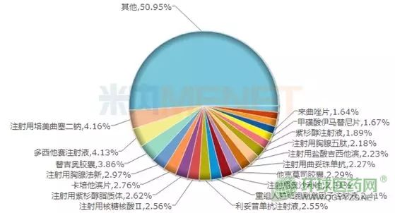 據(jù)米內(nèi)網(wǎng)數(shù)據(jù),2017年中國(guó)公立醫(yī)療機(jī)構(gòu)終端抗腫瘤和免疫調(diào)節(jié)劑TOP20產(chǎn)品,注射用培美曲塞二鈉以4.13%的比例位居首位,多西他賽注射液以4.09%的比例緊接其后,目前這2個(gè)大品種均有企業(yè)的產(chǎn)品通過(guò)或視同通過(guò)一致性評(píng)價(jià)。