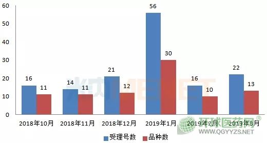 近半年來(lái),CDE每月承辦的注射劑一致性評(píng)價(jià)補(bǔ)充申請(qǐng)受理號(hào)平均在16個(gè)左右(品種數(shù)在10個(gè)左右),2019年1月,注射劑一致性評(píng)價(jià)補(bǔ)充申請(qǐng)受理號(hào)出現(xiàn)爆發(fā),達(dá)到56個(gè)受理號(hào)(30個(gè)品種),之后又回歸平均水平。