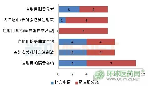 從企業(yè)申報(bào)的品種數(shù)看,按一致性評(píng)價(jià)補(bǔ)充申請(qǐng)或按新注冊(cè)分類申報(bào)上市的企業(yè)有7家或7家以上的品種有6個(gè),其中注射用帕瑞昔布鈉以11家企業(yè)申報(bào)成為“最熱門(mén)”的品種,抗腫瘤用藥注射用培美曲塞二鈉、精神安定藥鹽酸右美托咪定注射液以8個(gè)企業(yè)申報(bào)并列第二。