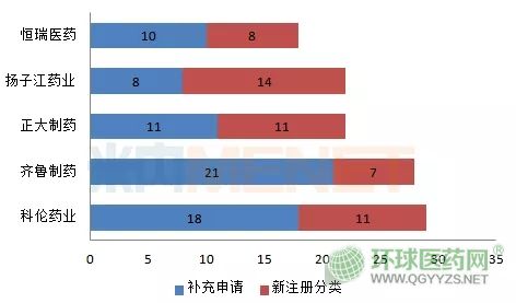 從申報(bào)的企業(yè)看,按一致性評(píng)價(jià)補(bǔ)充申請(qǐng)或按新注冊(cè)分類申報(bào)上市的企業(yè)中,申報(bào)品種數(shù)TOP5企業(yè)為科倫藥業(yè)、齊魯制藥、正大制藥、揚(yáng)子江藥業(yè)、恒瑞醫(yī)藥,其中有4家企業(yè)申報(bào)品種數(shù)超過(guò)20個(gè)。科倫藥業(yè)以49個(gè)受理號(hào),29個(gè)品種數(shù)獨(dú)占鰲頭。