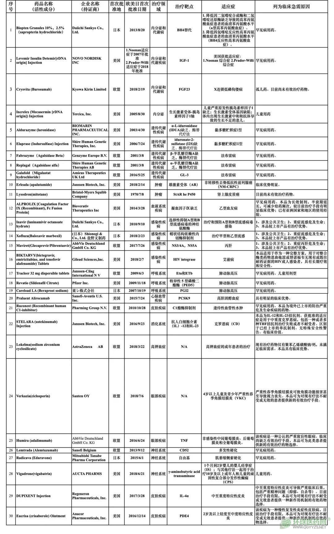 根據(jù)通知,此次名單中的30種藥品中,首次批準(zhǔn)地集中在歐盟、美國(guó)和日本。其中,14種藥品為罕見病用藥,包括治療法布雷。‵abry)的Fabrazyme(Agalsidase Beta),治療肺動(dòng)脈高壓的Revatio(Sildenafil Citrate)、治療肌萎縮側(cè)索硬化(ALS,俗稱“漸凍人癥”)的Radicava (Edaravone)等。