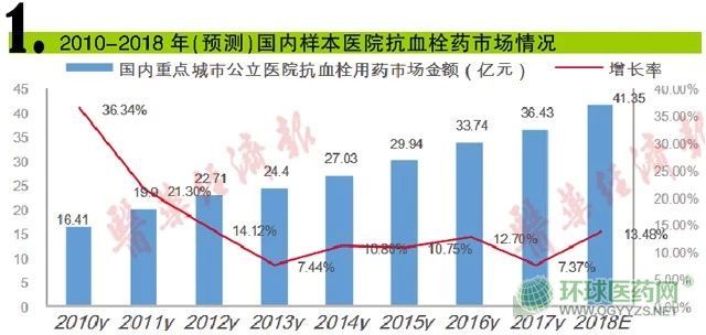 據(jù)米內(nèi)網(wǎng)數(shù)據(jù),2018年1-3季度國內(nèi)重點城市公立醫(yī)院抗血栓用藥市場為30.86億元,預測全年將達41.35億元,同比上一年增長13.48%。
