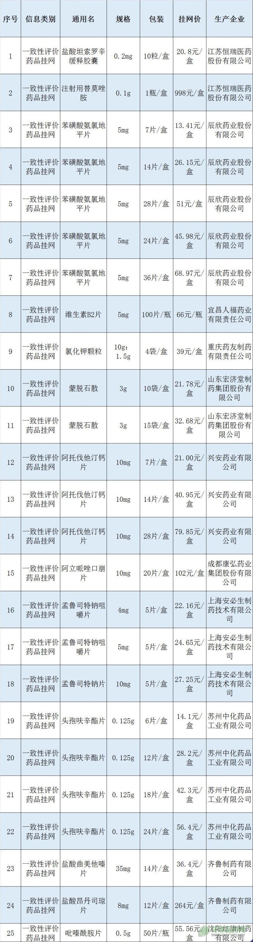 除14個(gè)藥品撤網(wǎng)外,還有25個(gè)過一致性評價(jià)藥品掛網(wǎng),如苯磺酸氨氯地平片、阿托伐他汀鈣片、孟魯司特鈉片、頭孢呋辛酯片等。