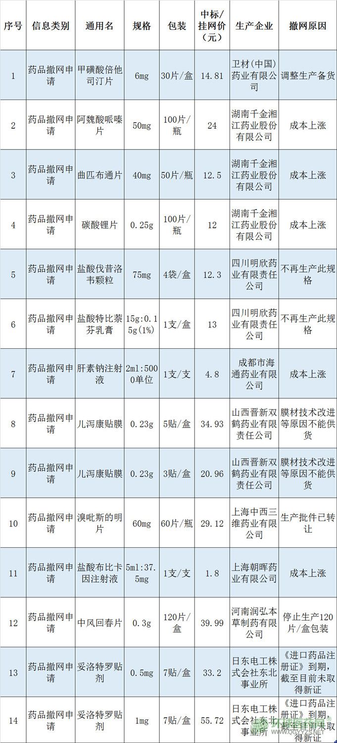 此外還有6個(gè)藥品因生產(chǎn)批件轉(zhuǎn)讓、調(diào)整生產(chǎn)備貨、技術(shù)改進(jìn)、進(jìn)口藥品注冊證到期等原因撤網(wǎng)。