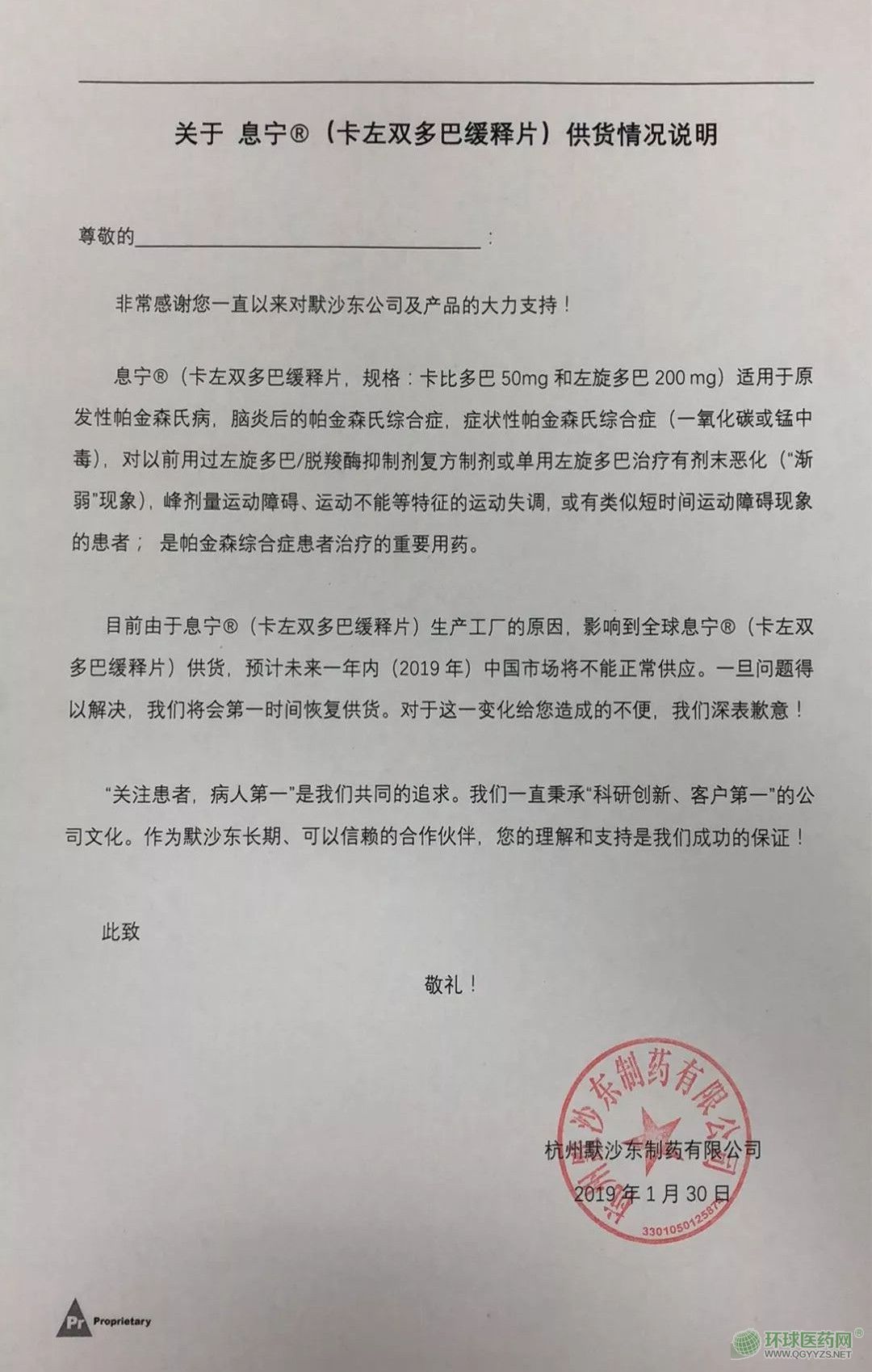 根據(jù)帕金森病友會(huì)公眾號(hào)消息,生產(chǎn)廠家默沙東提供的息寧供貨說(shuō)明函顯示,本次斷貨是由于生產(chǎn)工廠的原因,影響全球息寧的供貨,預(yù)計(jì)未來(lái)一年內(nèi)(2019年)中國(guó)市場(chǎng)將不能正常供應(yīng)。
