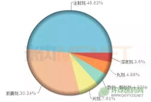 從劑型來看,主要有注射劑、膠囊劑,這兩大劑型合計占比近80%。其中,注射劑占48.63%,膠囊劑占30.34%。此外,還有片劑、散劑、顆粒劑、丸劑和溶液劑。