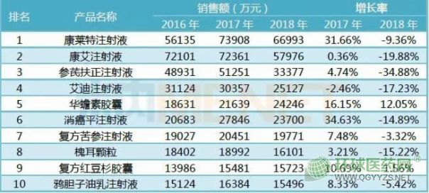 2018年重點城市公立醫(yī)院抗腫瘤中成藥產(chǎn)品TOP10銷售額合計30億元,占重點城市公立醫(yī)院抗腫瘤中成藥銷售額比例超過55%;除了華蟾素膠囊、槐耳顆粒和復方紅豆杉膠囊外,7個均是注射劑產(chǎn)品。