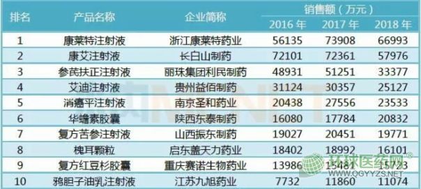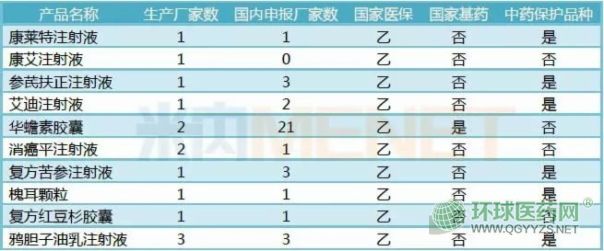 產(chǎn)品TOP10均是醫(yī)保乙類,其中,康萊特注射液、參芪扶正注射液、艾迪注射液、復方苦參注射液等6個產(chǎn)品是中藥保護品種;華蟾素膠囊是國家基藥。值得一提的是,這10個產(chǎn)品中有7個是獨家。