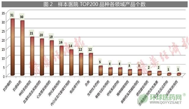 在TOP200品種中,抗腫瘤藥有31個,抗感染藥30個,神經(jīng)系統(tǒng)用藥21個,血液和造血系統(tǒng)用藥20個,心血管系統(tǒng)用藥19個,消化系統(tǒng)用藥16個,內(nèi)分泌及代謝調(diào)節(jié)用藥14個,免疫調(diào)節(jié)劑12個,雜類12個,其它領(lǐng)域都在10個以下。其中,增速在10%以上的品種有66個。