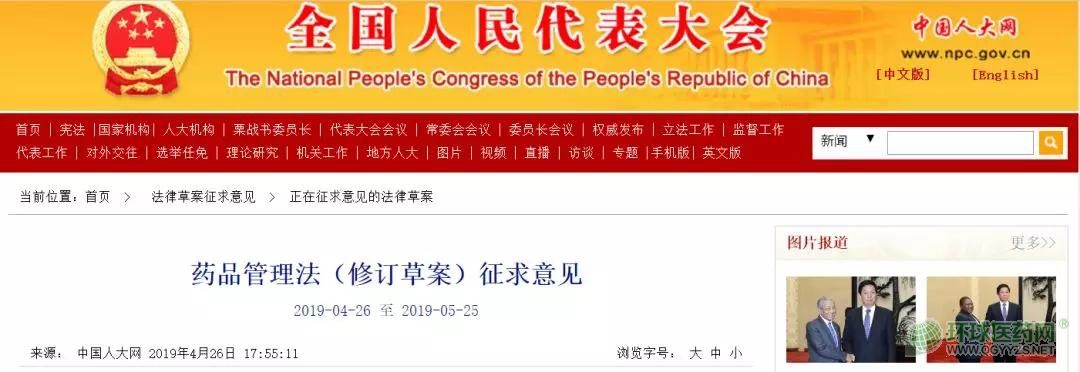 4月26日下午,中國人大網(wǎng)發(fā)布“藥品管理法(修訂草案)征求意見”,征求意見日期為4月26日-5月25日。