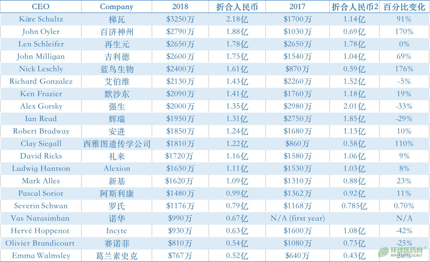 名單列出了20名大型上市制藥公司CEO的薪酬榜單。