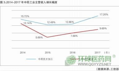 中藥飲片需求高速增長(zhǎng)。工信部發(fā)布的數(shù)據(jù)顯示,2014~2017年,中成藥制造業(yè)主營(yíng)業(yè)務(wù)收入平均增速只有9.1%;而同時(shí)期,中藥飲片工業(yè)的增速高達(dá)14.52%(見圖3)。據(jù)統(tǒng)計(jì),2018年中藥飲片板塊增加的需求量可直接拉動(dòng)原藥材銷售量增長(zhǎng)20萬噸,銷售額在76億元左右。