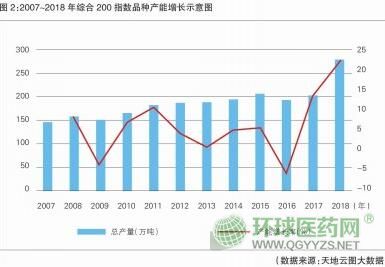 一是家種藥材快速發(fā)展,供給明顯過剩。在中醫(yī)藥產(chǎn)業(yè)快速發(fā)展及精準(zhǔn)扶貧的背景下,發(fā)展中藥材生產(chǎn)成為熱點(diǎn)。有分析顯示,2018年全國(guó)585個(gè)貧困縣幾乎全在發(fā)展中藥材種植,擴(kuò)張前10位品種分別是柴胡、黃芪、黨參、桔梗、黃芩、黃精、重樓、板藍(lán)根、白及和金銀花(見圖1)。2004~2017年,綜合200指數(shù)品種產(chǎn)能從104.73萬噸增長(zhǎng)到202.16萬噸,增長(zhǎng)了93.03%,年均增速6.65%。2018年,綜合200指數(shù)品種產(chǎn)能突破282.68萬噸,同比增速達(dá)23.30%,超過需求增速10.02個(gè)百分點(diǎn),產(chǎn)能嚴(yán)重過剩(見圖2)。