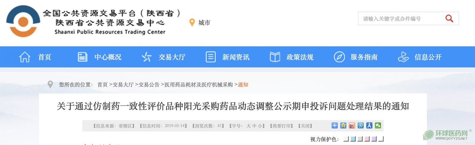 近日(5月14日),陜西省公共資源交易中心發(fā)布《關于通過仿制藥一致性評價品種陽光采購藥品動態(tài)調整公示期申投訴問題處理結果的通知》(以下簡稱《通知》。