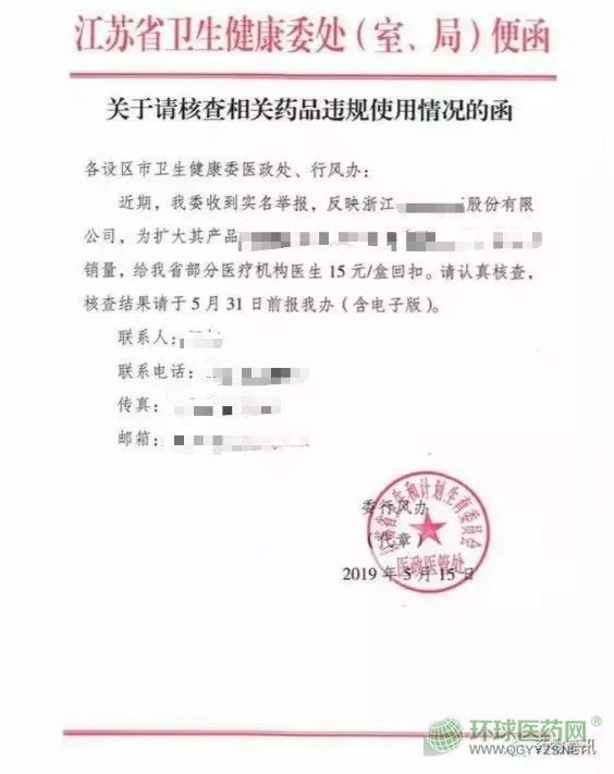 根據(jù)通知,江蘇省衛(wèi)健委在近期收到了實名舉報,反映某藥企為擴大其產(chǎn)品的銷量,給江蘇省部分醫(yī)療機構醫(yī)生15元/盒的回扣。江蘇省衛(wèi)健委要求各區(qū)市衛(wèi)健委醫(yī)政處、行風辦要認真核查,核查結果在5月31日前藥上報江蘇省衛(wèi)健委。