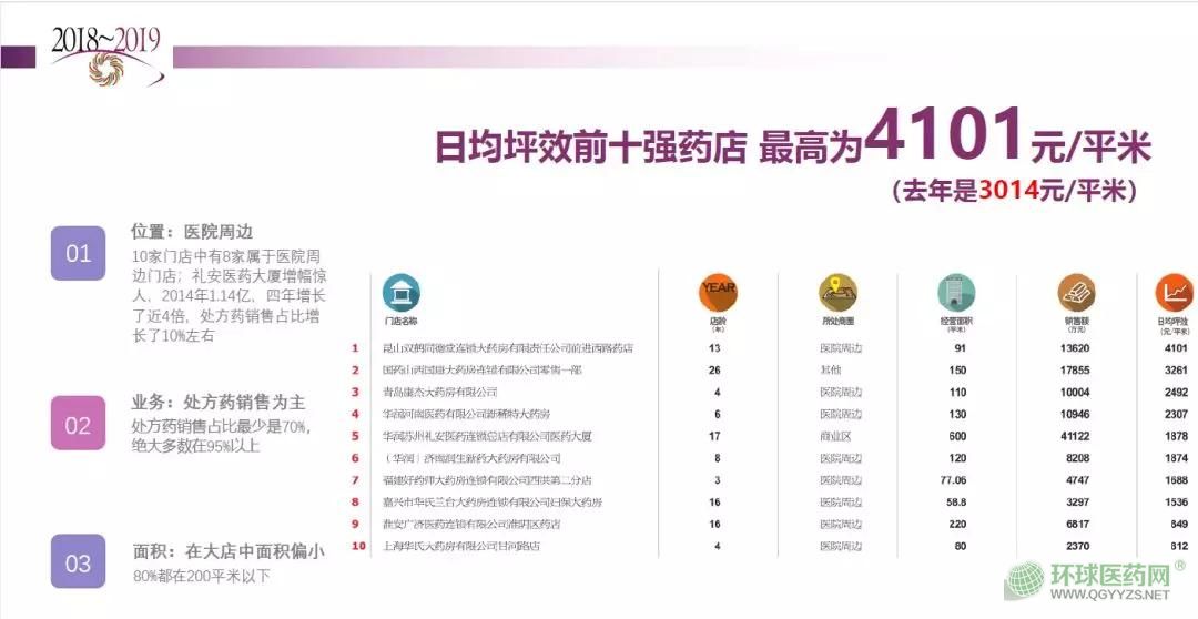 根據(jù)2018-2019中國藥店發(fā)展報(bào)告,日均坪效(意思是一家藥店每天每坪的面積可以產(chǎn)出多少營業(yè)額)前十強(qiáng)藥店中,有 8家屬于醫(yī)院周邊門店;這些院邊店處方藥銷售占比最少是70%,絕大多數(shù)在95%以上。