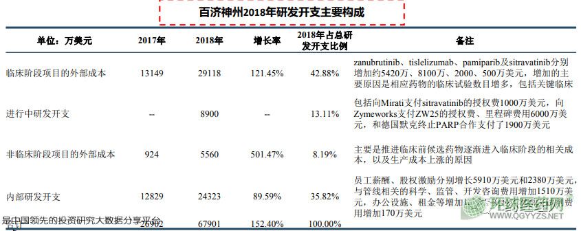 百濟(jì)神州占比最高的項(xiàng)目是臨床階段項(xiàng)目的外部成本及內(nèi)部研發(fā)開支費(fèi)用,主要是相應(yīng)藥物臨床試驗(yàn)數(shù)目增多,員工薪酬、股權(quán)激勵(lì)費(fèi)用增加所致。此外,與2017年相比,非臨床階段項(xiàng)目的外部成本曾都較大,主要是推進(jìn)臨床前候選藥物逐漸進(jìn)入臨床階段。這說(shuō)明百濟(jì)神州在研管線豐厚。