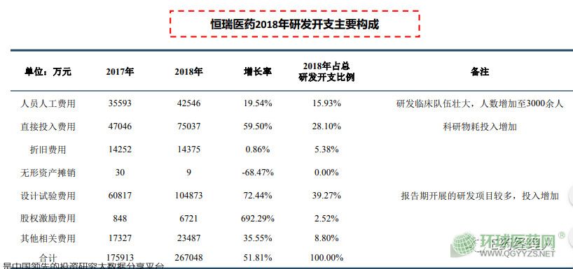 從恒瑞2018年研發(fā)開支構(gòu)成來(lái)看,占比最高的項(xiàng)目是臨床設(shè)計(jì)試驗(yàn)費(fèi)用及直接投入費(fèi)用,分別占研發(fā)提升總額的48.34%和30.7%。另外,薪酬增長(zhǎng)率為19.54%的同時(shí)股權(quán)激勵(lì)費(fèi)用增長(zhǎng)率為692.29%,說(shuō)明恒瑞著重使用股權(quán)激勵(lì)策略調(diào)動(dòng)核心員工積極性。這樣的研發(fā)投入結(jié)構(gòu)也能看出恒瑞醫(yī)藥堅(jiān)持自主研發(fā)模式為主。