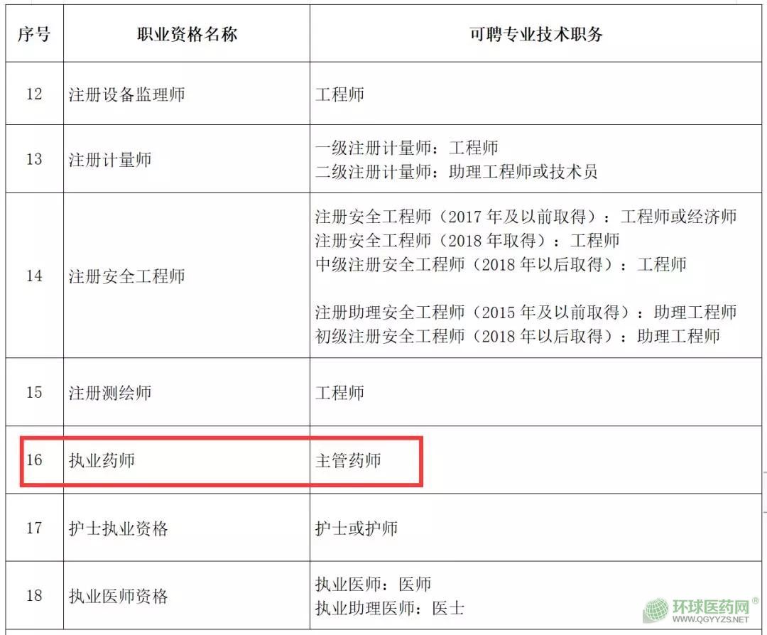 其中,46項(xiàng)專業(yè)技術(shù)人員職業(yè)資格包括18項(xiàng)準(zhǔn)入類職業(yè)資格、19項(xiàng)水平評(píng)價(jià)類職業(yè)資格以及9項(xiàng)其他資格。值得注意的是,18項(xiàng)準(zhǔn)入類職業(yè)資格中就含有執(zhí)業(yè)藥師,且對應(yīng)的專業(yè)技術(shù)職務(wù)為主管藥師。