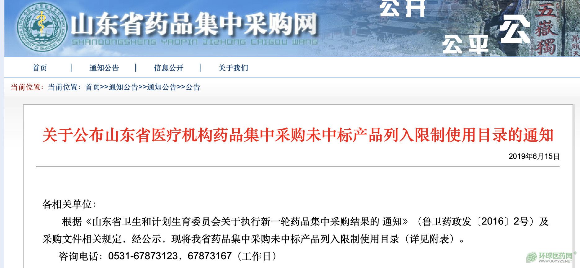 通知明確,根據(jù)《山東省衛(wèi)生和計(jì)劃生育委員會關(guān)于執(zhí)行新一輪藥品集中采購結(jié)果的通知》(魯衛(wèi)藥政發(fā)〔2016〕2號)及采購文件相關(guān)規(guī)定,經(jīng)公示,現(xiàn)將山東省藥品集中采購未中標(biāo)產(chǎn)品列入限制使用目錄。