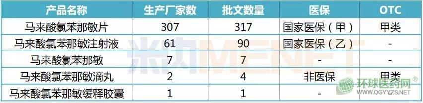 馬來酸氯苯那敏為抗組胺類藥,主要用于鼻炎、皮膚黏膜過敏以及緩解流淚、打噴嚏、流涕等感冒癥狀的藥物的生產(chǎn)制造。據(jù)米內(nèi)網(wǎng)數(shù)據(jù)顯示,目前該品種涉及的產(chǎn)品包括了片劑、注射劑、丸劑以及膠囊劑,涉及企業(yè)超過300家。