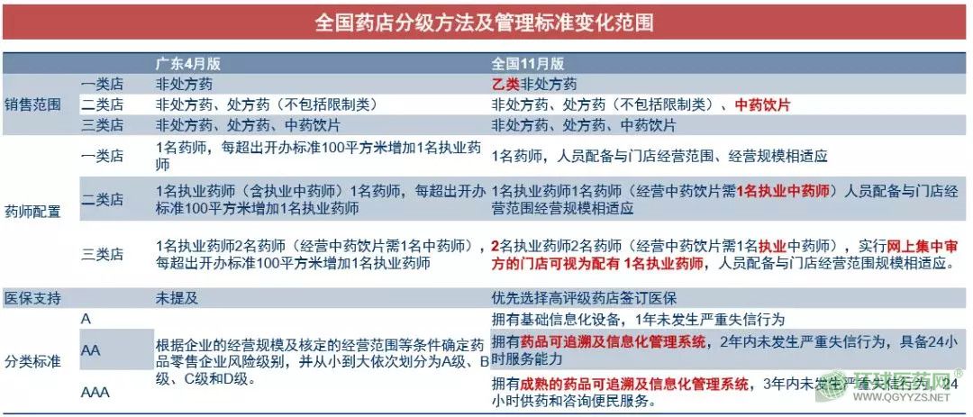 值得注意的是,已試行的廣東省和還在征求意見的全國性文件存在一定差異,廣東省對于一類店,經(jīng)營范圍限定為非處方藥,而全國性的則只能銷售乙類非處方藥。其次,對于二類店,廣東省則將重點放在中藥飲片上,只有三類店可以經(jīng)營中藥飲片,而全國性的則二類店也可以經(jīng)營中藥飲片。