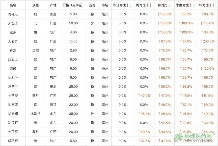 (數(shù)據(jù)來源:藥通網(wǎng),市場為亳州市場,以年度漲幅進行排序)