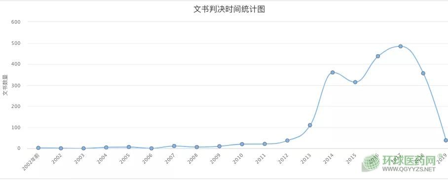 從文書判決時間統(tǒng)計來看,關(guān)鍵詞為“醫(yī)藥”“行賄”的案件數(shù)量,從2013年開始明顯爬升,2017年到達(dá)峰值,隨后開始急速下滑。截至目前2019年已過半,但此類判決文書的數(shù)量只有2018年的1/10左右,數(shù)量明顯降低。