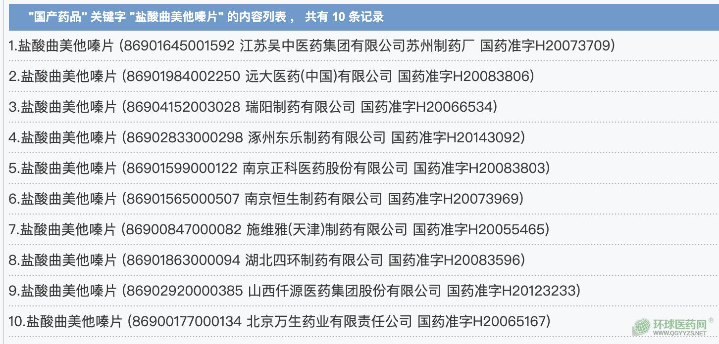 賽柏藍在國家藥監(jiān)局官網(wǎng)以“鹽酸曲美他嗪片”為關鍵詞搜索,共有10條記錄。
