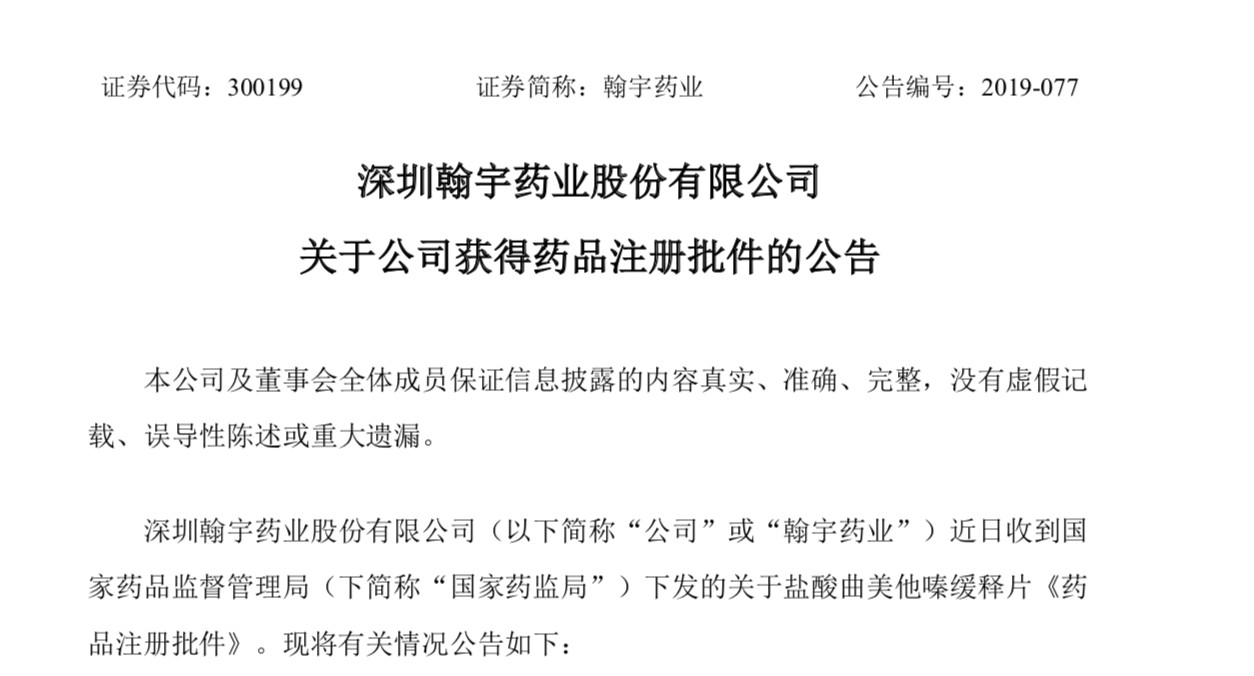 近日,深圳翰宇藥業(yè)發(fā)布公告,收到了國家藥監(jiān)局下發(fā)的關于鹽酸曲美他嗪緩釋片《藥品注冊批件》。自此之后,鹽酸曲美他嗪緩釋片(35mg)這一品規(guī),翰宇藥業(yè)成為繼齊魯制藥、恒瑞醫(yī)藥后第三家過一致性評價的企業(yè)。