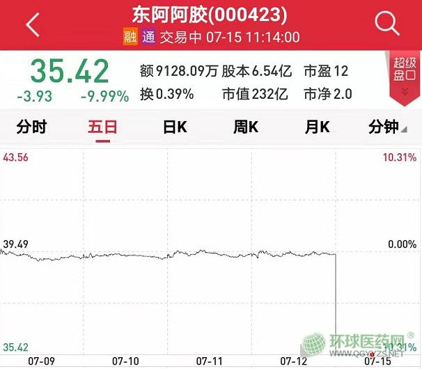 7月15日一開盤股票跌停,報35.42元/股,對應跌幅9.99%,對應總市值232億元,相比較上周五(7月12日)收盤價39.35元/股、總市值257億元,東阿阿膠總市值縮水25億。
